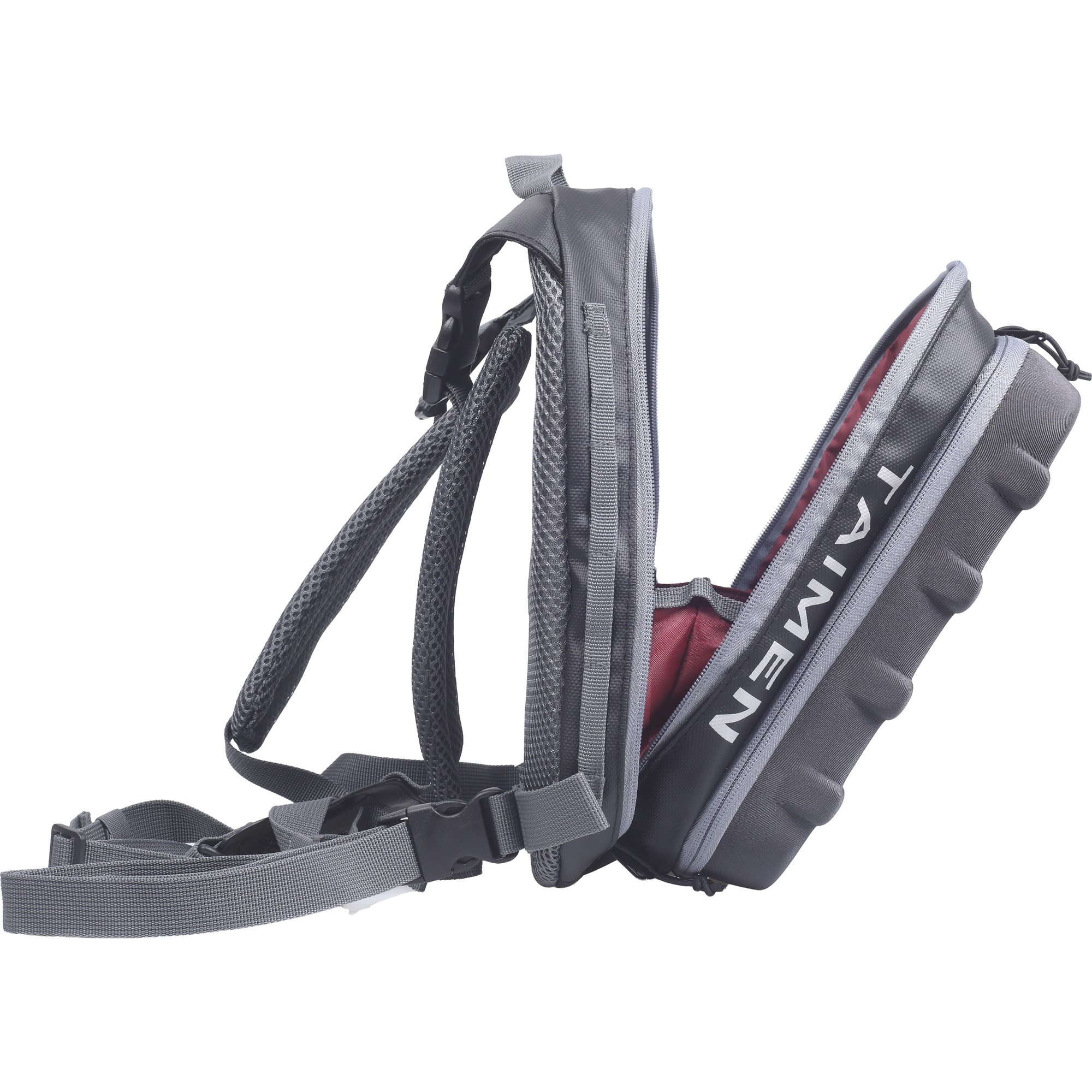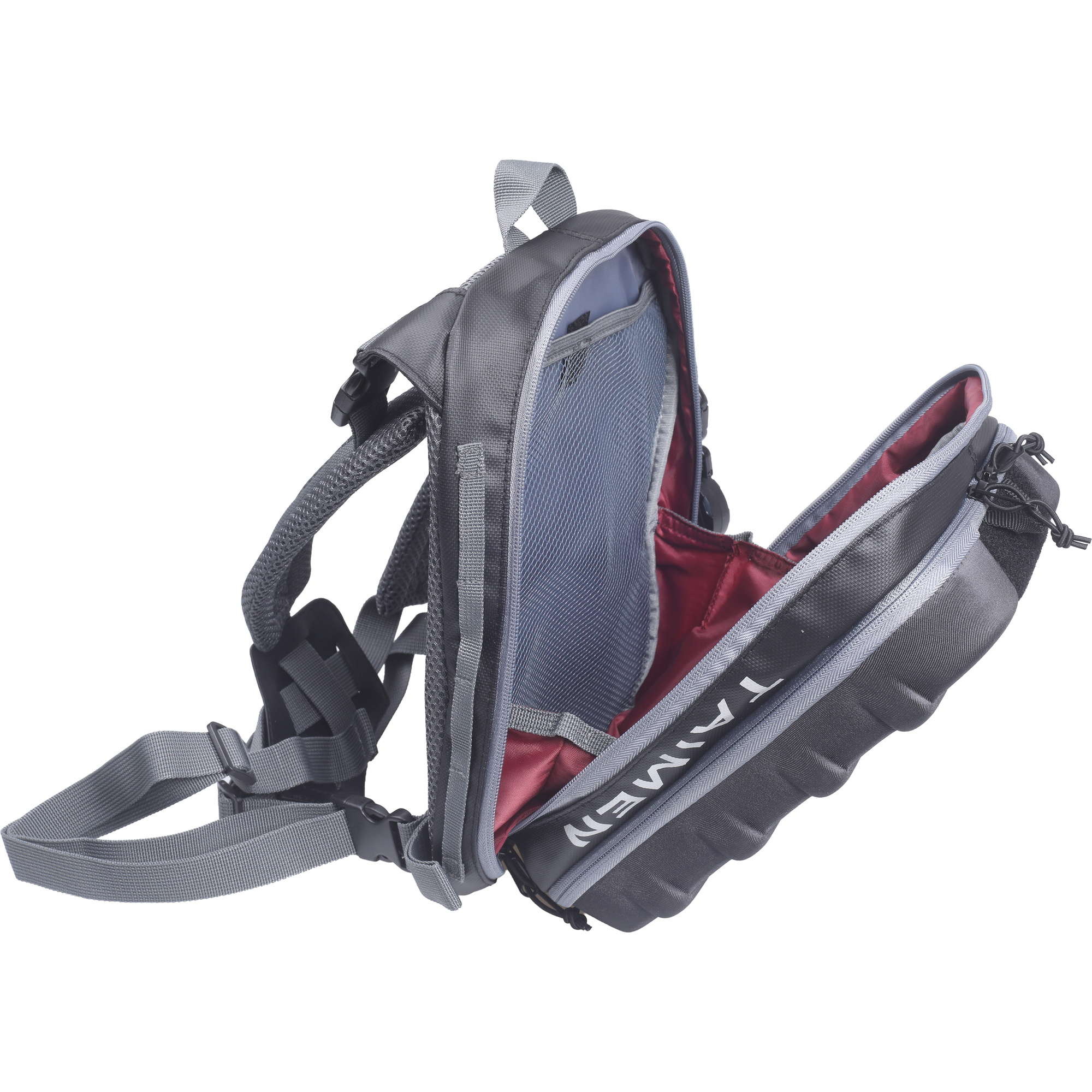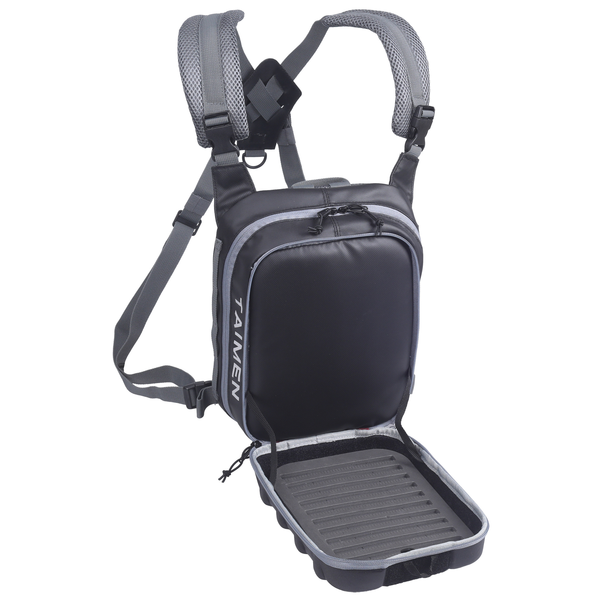 Taimen Egiin Chest Bag – Black is a technical fly fishing chest pack designed to keep your most important flies and accessories exactly where you need them – on your chest and within instant reach. The rigid EVA front panel protects the contents and, when opened, turns into a convenient work tray for changing flies on the water.