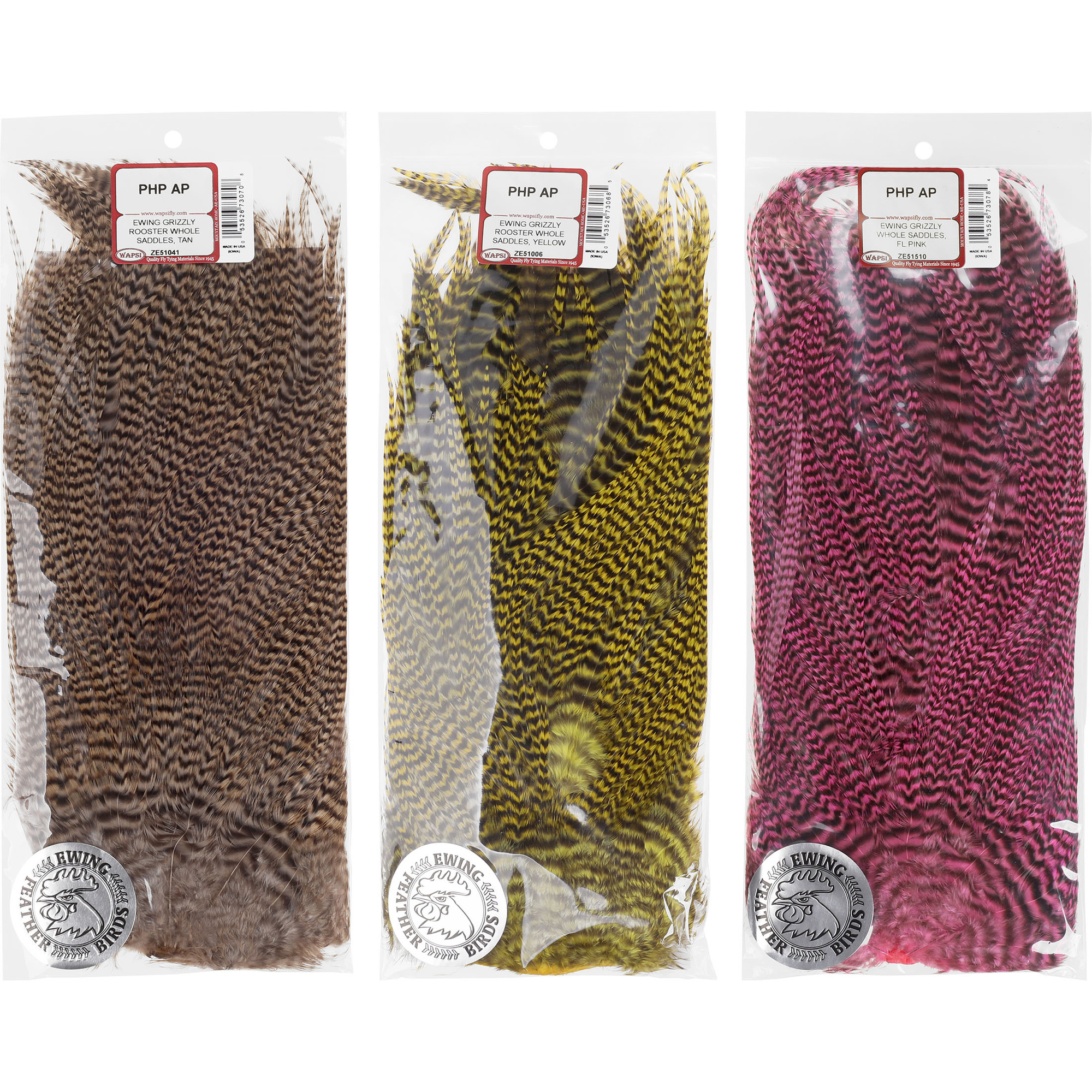 Selle intere Ewing Grizzly: Scelte dai professionisti, le selle intere Grizzly di Ewing sono ideali per creare un'ampia gamma di mosche. Caratterizzate dal classico motivo "grizzly", queste selle intere forniscono piume più lunghe e uniformi, preferite dai pescatori che apprezzano la precisione e la qualità. Perfetta per la realizzazione di imitazioni di insetti arger e streamer. Resistenti e flessibili, le piume di Ewing sono sinonimo di longevità e di aspetto naturale e sono indispensabili nell'arsenale di ogni appassionato di fly-tying.